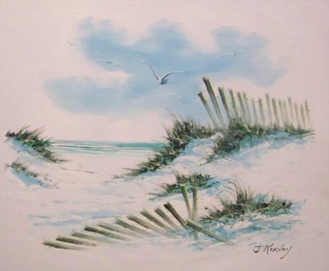 This is a painting of a beach scene with a wooden fence, sand dunes, and seagulls flying in the sky. The colors are predominantly blue and green, with a peaceful and serene mood. The painting is signed by the artist in the bottom right corner.
