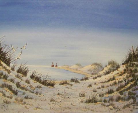 This is a painting of a beach scene with sand dunes and a body of water in the background. The painting is done in a realistic style with a muted color palette. The sand dunes are covered in grass and the body of water is a light blue. There are two sailboats on the water in the background. The sky is a light blue with wispy clouds. The painting is signed in the bottom right corner.