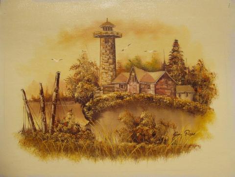 The painting depicts a charming and idyllic countryside scene, where a stone lighthouse towers over a cluster of wooden buildings. The structures are surrounded by lush greenery and a calm pond, creating a sense of harmony and tranquility. The warm golden tones of the painting evoke a feeling of nostalgia and coziness, while the birds in flight add a touch of liveliness and movement. The painting captures the beauty and simplicity of rural life, inviting the viewer to imagine themselves in this serene setting.