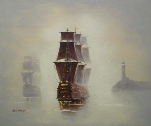This is a painting of three ships sailing on a foggy sea. The central ship is the largest and most detailed, with a red flag flying from the top of its mast. The other two ships are in the background and are less detailed. The painting is done in a realistic style with a muted color palette. The painting is signed in the lower left corner.