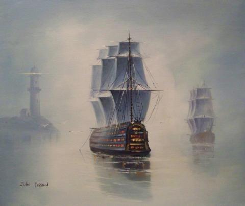 This is a painting of three ships sailing on a foggy sea. The central ship is the largest and most detailed, with a red flag flying from the top of its mast. The other two ships are in the background and are less detailed. The painting is done in a realistic style with a muted color palette. The painting is signed in the lower left corner.