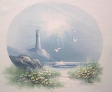 This is a painting of a lighthouse on a cliff overlooking the ocean. The painting is done in a soft, pastel style with a circular frame. The lighthouse is white with a black top and there are seagulls flying around it. The ocean is a light blue and there are white flowers in the foreground. The painting is a tranquil and serene depiction of a coastal scene, using a harmonious color palette and a gentle brushstroke. The painting evokes a sense of calmness and peace.