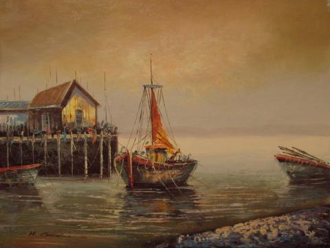 This painting captures a serene and tranquil scene of a dock. A boat with a prominent orange sail is moored near wooden structures, possibly homes or storage sheds, built on stilts over the water. Another boat is visible to the right, and both are equipped with masts suggesting they are sailing vessels. The calm waters reflect the warm hues of the sky at what appears to be either dawn or dusk, imbuing the entire scene with a tranquil and peaceful ambiance.