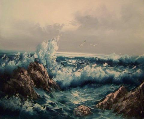 The painting depicts a dramatic and turbulent ocean scene, where powerful waves crash against the jagged rocks in the foreground. The color palette is dominated by shades of blue and gray, creating a somber and cold atmosphere. The white foam on the waves contrasts with the dark sky, which is filled with stormy clouds. A few birds can be seen flying in the background, adding a touch of life to the otherwise hostile environment. The painting conveys a sense of awe and fear at the force of nature.