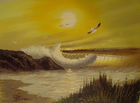 This is a painting that depicts a vibrant seascape during what appears to be sunset. A large wave is crashing into rocky cliffs that are dark and rugged. The sky is painted in warm hues of yellow and orange with a bright sun partially obscured by clouds. Several seagulls are painted mid-flight; one prominent seagull is closer to the foreground with wings spread wide. Tufts of dark green grass are visible in the foreground at the bottom right corner. The overall mood conveyed by this artwork is one of natural beauty and harmony between earth, sea, and sky.