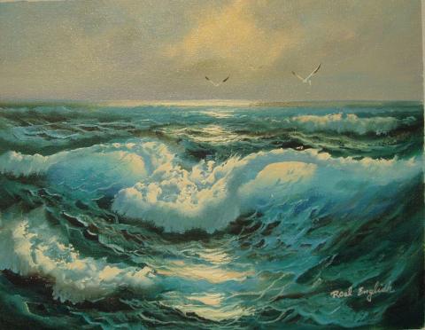 This is a painting of a seascape with a turbulent ocean and a cloudy sky. The painting is done in a realistic style with a focus on the movement of the water and the colors of the sky. The ocean is a deep blue-green color with white foam on the waves. The sky is a pale yellow color with darker clouds on the horizon. There are two birds flying in the sky. The painting is signed in the lower right corner.
