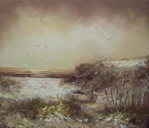 This painting is a charming and colorful depiction of a beach scene with a boat on the shore and seagulls flying in the sky. The artist has used a muted color palette to create a warm and cozy effect. The boat is on the shore and appears to be abandoned, adding a touch of mystery and nostalgia to the scene. The seagulls are flying in the sky, creating a sense of movement and freedom. The painting has a sense of tranquility and peacefulness, as if the viewer is invited to relax and enjoy the view. The painting is signed by the artist in the lower right corner. The painting is a lovely and inviting piece of art that captures the beauty and calmness of a beach scene.