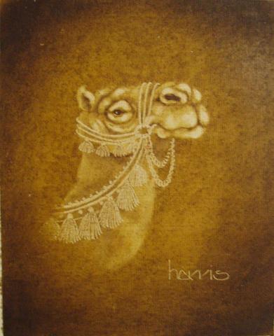 The painting captures the profile of a camel, adorned with a decorative harness that features intricate tassels, suggesting a sense of regality and tradition. The camel’s calm demeanor is set against a warm brown background, which complements its natural color palette. The artist’s signature, discreetly placed in the lower right corner, adds authenticity to the piece. The realistic style of the painting brings the camel to life, inviting viewers to appreciate the beauty and grace of this majestic creature.
