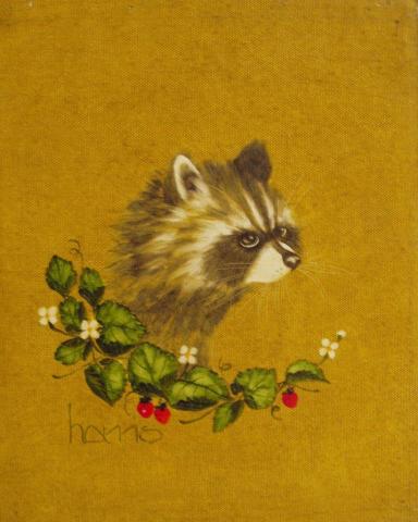 The painting depicts a raccoon’s head and upper body, set against a mustard yellow background. The raccoon, characterized by its distinctive facial mask and bushy tail, is captured in a moment of stillness, looking to the right. It is framed by a naturalistic arrangement of green leaves and red berries, which adds a vibrant contrast to the scene. The artwork is signed “Harris” in the lower left corner, suggesting the artist’s personal touch to this wildlife portrait. The use of color and composition evokes a sense of curiosity and connection with the natural world.
