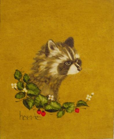 The painting depicts a raccoon’s head and upper body, set against a mustard yellow background. The raccoon, characterized by its distinctive facial mask and bushy tail, is captured in a moment of stillness, looking to the right. It is framed by a naturalistic arrangement of green leaves and red berries, which adds a vibrant contrast to the scene. The artwork is signed “Harris” in the lower left corner, suggesting the artist’s personal touch to this wildlife portrait. The use of color and composition evokes a sense of curiosity and connection with the natural world.