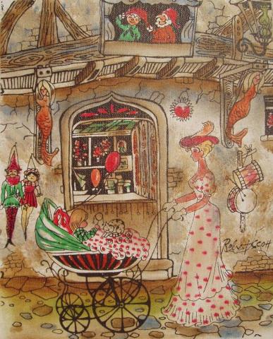 The painting is a quaint depiction of a woman pushing a baby carriage in front of a store window, set within the cozy confines of a gallery. The folk art style lends a charming simplicity to the scene, with the woman dressed in a red and white polka dot dress and a white hat, complementing the red and black baby carriage with its white canopy. The store window, festooned with Christmas decorations, invites a festive spirit, while the cobblestone street and brick building in the background anchor the scene in a timeless setting. Figures in the background, including a man in a green suit and a woman in a blue dress, add depth and life to this endearing composition.