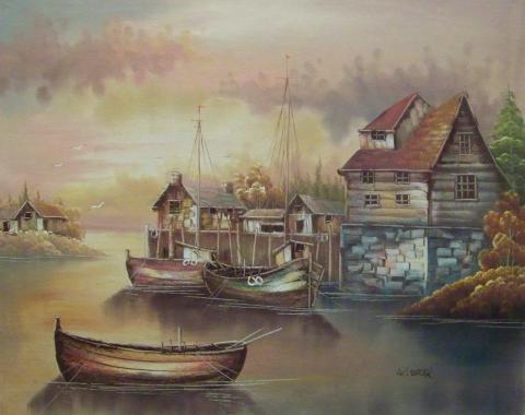 The painting depicts a tranquil harbor scene, where the soft hues of pink and orange blend into the sky, casting a serene glow over the water. Gentle clouds float above, mirroring their shapes in the harbor’s calm blue surface. Several boats, some with sails unfurled, float idly by, while on the shore, a collection of houses with thatched and shingled roofs offer a picturesque backdrop. Constructed of wood and stone, these homes exude a sense of warmth and stability. The artist’s signature, discreetly placed in the lower right corner, marks the completion of this peaceful vista. The overall mood of the painting is one of peace and stillness, inviting the viewer to pause and reflect.