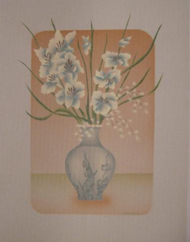This painting is a still life of a vase with blooming flowers, set against a muted background. The vase, adorned with intricate designs, holds a bouquet of white flowers with delicate petals, each marked by subtle strokes of blue and yellow at the center. The flowers are surrounded by slender green stems and leaves that extend gracefully, adding to the painting’s overall sense of harmony and beauty. The background is soft and muted, allowing the vibrant colors of the flowers and vase to stand out prominently.