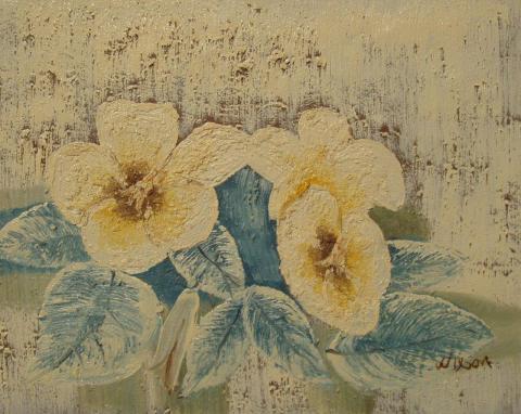 The painting presents a serene depiction of three hibiscus flowers in full bloom, their creamy white petals unfurling gracefully around the vibrant orange-yellow stamens. The background’s textured brushwork, featuring muted blues, whites, and browns, creates an abstract pattern that complements the flowers’ delicate beauty. The overall effect is one of rustic elegance, as the broad petals and detailed stamens stand out against the distressed, vintage-appearing backdrop, inviting the viewer to appreciate the natural elegance of these blossoming hibiscus.
