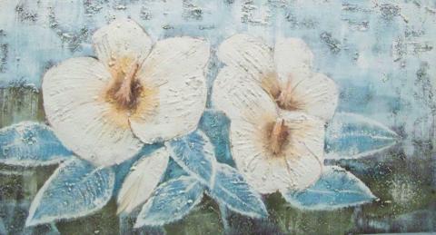 The painting presents a serene depiction of three hibiscus flowers in full bloom, their creamy white petals unfurling gracefully around the vibrant orange-yellow stamens. The background’s textured brushwork, featuring muted blues, whites, and browns, creates an abstract pattern that complements the flowers’ delicate beauty. The overall effect is one of rustic elegance, as the broad petals and detailed stamens stand out against the distressed, vintage-appearing backdrop, inviting the viewer to appreciate the natural elegance of these blossoming hibiscus.