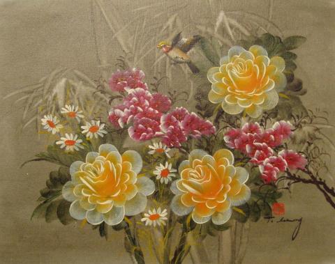 .The painting is a captivating blend of traditional and natural elements, featuring a black bird with a red head and yellow wings, perched on a branch adorned with pink and yellow flowers. The backdrop is a grayish color with bamboo leaves, adding a touch of Asian aesthetic to the composition. The flowers, with their pink, yellow, and white hues, provide a delicate contrast to the bird’s striking colors. Signed with a red stamp in the lower right corner, the painting exudes a sense of elegance and tranquility, characteristic of traditional Eastern art.