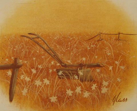 The painting is a tranquil depiction of a rustic plow, its surface bearing the marks of age and use, nestled in a field of bright white flowers. The warm orange backdrop of the sky lends a soft, comforting glow to the scene, while the artist’s signature in the bottom right corner adds a personal touch. The loose, impressionistic style of the painting allows the viewer’s eye to wander and explore the interplay between the man-made object and the natural beauty that surrounds it.