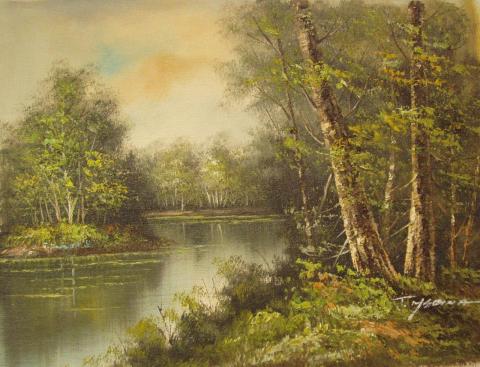 This is a painting of a serene natural landscape, where the calm waters of a lake are surrounded by lush greenery. Tall trees with detailed bark and leafy canopies stand prominently in the foreground, their branches extending upwards and outwards, framing the view of the lake. The reflection of the trees on the water’s surface adds to the tranquility of the scene. In the background, more trees line the far side of the lake, their forms becoming softer and more muted, creating a sense of depth and distance. The sky above is painted with soft hues, casting a gentle light that illuminates this peaceful setting.