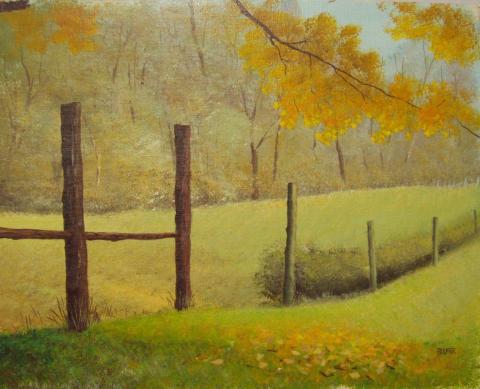 The painting portrays an idyllic autumnal setting, where a wooden fence meanders through a landscape adorned with trees whose leaves have turned a golden yellow. The warm colors of the scene evoke a sense of serenity and nostalgia for the crisp, cool days of fall. The grass, a soft light green, contrasts gently with the vibrant foliage, while the artist’s signature situated in the lower right corner, adds a personal touch to this tranquil depiction of the season’s beauty. The painting invites viewers to pause and appreciate the quiet charm of autumn’s splendor.