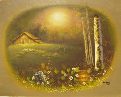 The painting you sent me is a countryside landscape by an unknown artist. It shows a cozy cabin with a thatched roof, surrounded by birch trees and wildflowers. The painting has a circular frame and is done in warm colors. The background is a hazy sky with a setting sun. The painting has a nostalgic and serene mood, and may evoke a sense of home and nature. The painting is signed “Travis” in the bottom right corner.