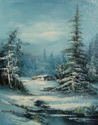 The painting is a serene depiction of a snowy landscape, where a small creek meanders through the scene, adding a dynamic element to the otherwise still environment. The realistic style and the blue and white color palette evoke the crisp, cold atmosphere of winter, while the artist’s signature in the bottom left corner adds a personal touch to the artwork. The oil on canvas medium enhances the textural quality of the snow and the reflections in the water, creating a sense of depth and inviting the viewer to experience the tranquility of the winter setting.