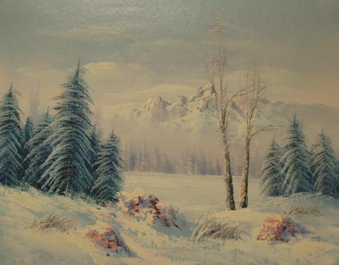 This painting captures a serene and tranquil winter landscape. Snow blankets the ground, covering rocks and the bases of trees, reflecting the soft light that permeates the scene. A group of evergreen trees, their branches heavy with snow, stand prominently to the left while a leafless tree, its branches stark against the backdrop of a distant mountain range obscured by mist or clouds, is positioned to the right. The sky is a gentle mix of colors suggesting either an early morning or late afternoon setting.