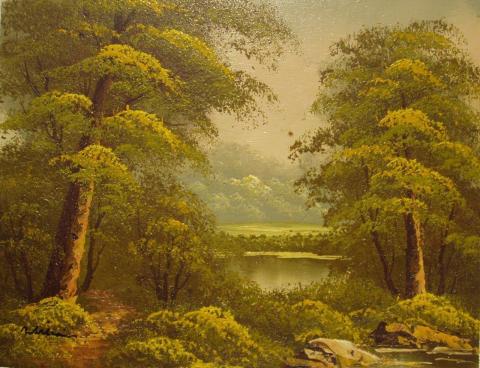 The painting portrays a landscape filled with trees, bushes, and a lake, rendered in an impressionistic style that emphasizes the play of light and color. The dominant greens and browns of the foliage are complemented by subtle blues in the sky and lake, creating a harmonious natural setting. Tall trees with abundant foliage stand alongside blooming green bushes, while the small lake, encircled by this verdant growth, mirrors the sky’s azure and the occasional cloud. This piece exudes a sense of tranquility and the timeless beauty of the natural world.