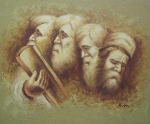 The image you sent is a painting of four bearded men who seem to be closely gathered around a book or some form of document, indicating a scene of discussion or study. One man holds the book/document open for others to see. The color palette consists mainly of warm and earthy tones. The background is textured but nondescript, focusing attention on the central figures. It appears to be an artwork signed by “Morris.”