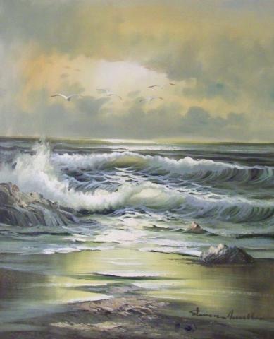 The painting shows a striking and contrasting seascape, where the deep green sea meets the pale yellow sky. The shore is rocky and the waves are crashing with white foam. The signature of the artist can be seen in the lower right corner. The painting is in an impressionistic style, with loose brushstrokes and vibrant colors. The painting is vertical, with a horizontal horizon dividing the sea and the sky. The painting is mostly in warm colors, such as yellows, oranges, and greens, creating a lively and dynamic effect. The sky is cloudy, but some light can be seen in the center, suggesting a sun behind the clouds. The painting conveys a sense of movement and energy at the coast.
