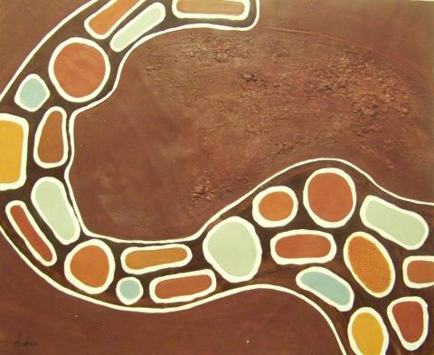 This abstract painting features a prominent, curved white line filled with various shapes of different colors against a rich, brown background. The shapes within the white line are painted in shades of orange, yellow, and white. The overall composition gives the impression of a segmented structure or pathway, with each segment housing these colored shapes. The brown background has variations in its hue and texture, providing depth and contrast to the vividly colored shapes within the curved line.