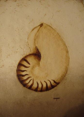This abstract painting features a nautilus shell-like form, rendered with a rich interplay of light and shadow to accentuate its spiraled structure. The object is set against a textured, monochromatic background that complements the central form’s organic curves and lines. The artwork exudes a sense of natural elegance and simplicity, inviting viewers to appreciate the inherent beauty found in nature’s intricate designs.