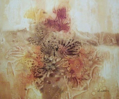 This painting is an abstract piece that features a blend of warm tones and intricate textures. The central focus appears to be a complex, layered formation, reminiscent of natural elements like flowers or coral, surrounded by a soft, diffused background. The artist has skillfully used variations in color and texture to create depth and movement within the composition. The painting invokes a sense of organic beauty as if inspired by nature’s underwater or floral scenes.