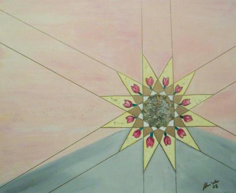 This painting is a radiant composition of a star-like shape in a pastel-colored background. The star has intricate designs on its points and core, creating a striking contrast with the soft hues of the canvas. The star also emits lines that divide the painting into sections with different shades, adding depth and dimension. The painting has a calm and serene mood, with a subtle signature in one corner.