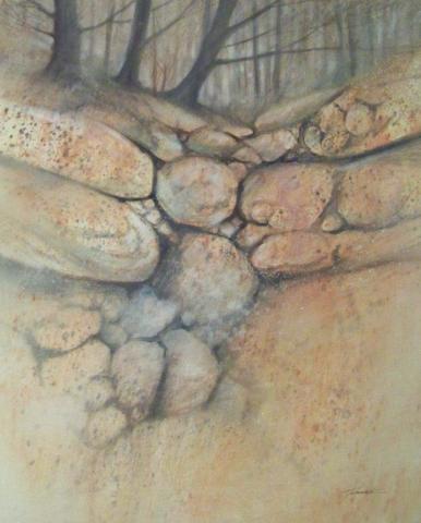 The painting portrays a serene and natural scene, where the bare branches of trees are intricately intertwined with a formation of rocks. The rocks, meticulously painted in various sizes and shapes, exude earthy tones that harmonize with the muted background. The slender and graceful branches of the trees stretch upwards, filling the upper part of the painting. The overall color palette of browns and grays evokes a calm and peaceful atmosphere, inviting contemplation of the interplay between the organic forms of the trees and the solidity of the rocks.
