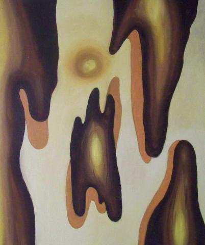 The painting is an abstract composition with a beige background that sets a neutral stage for the dark brown and gold shapes that dominate the canvas. These shapes are organic and fluid, suggesting natural forms like leaves or petals, with a central gold shape that stands out as a focal point, reminiscent of a sun or a flower. The interplay of colors and forms creates a dynamic yet harmonious visual experience, inviting viewers to interpret the imagery in their own unique way. The overall effect is one of elegance and mystery, characteristic of abstract art’s ability to evoke emotions and thoughts without explicit representation.