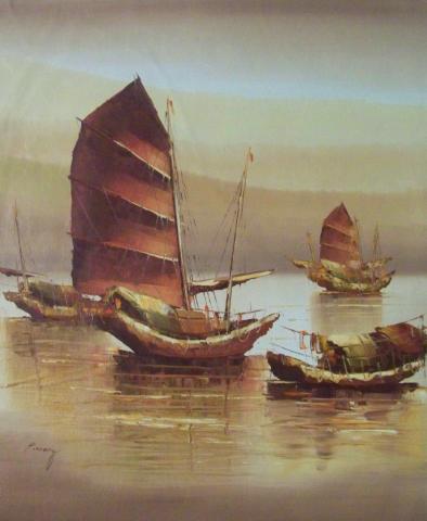 This is a painting of four boats on a body of water. The boats have sails and are of different sizes. The painting is done in a realistic style with a warm color palette. The background is a hazy sky with a horizon line. The water is calm and the boats are reflected in it. The painting is signed “C. Wong” in the lower left corner. The painting conveys a sense of tranquility and serenity, as the boats seem to be floating peacefully on the water. The painting evokes a feeling of admiration and appreciation for the painter’s skill and craftsmanship.